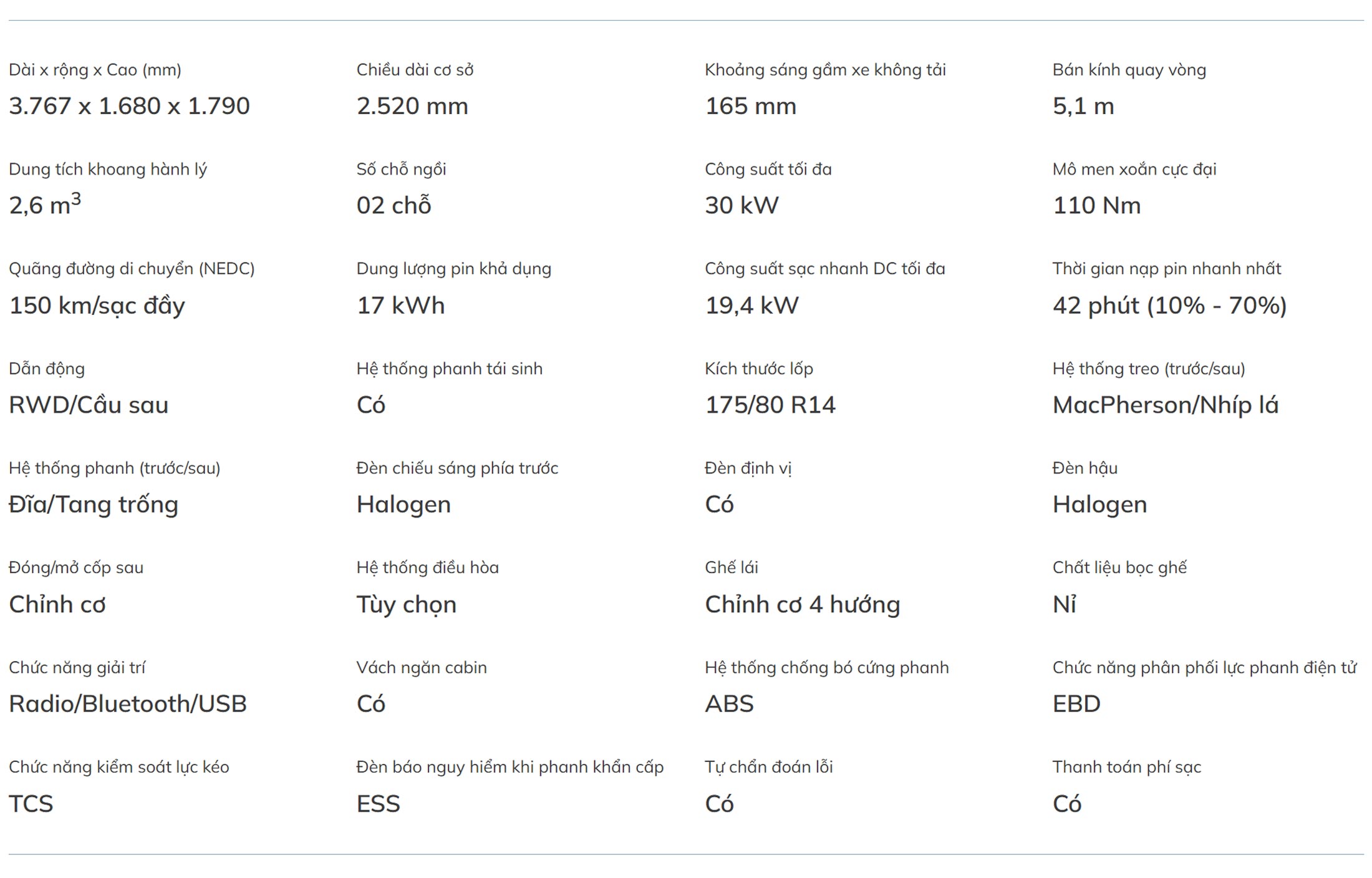 VinFast EC Van xe tải điện đô thị nhỏ gọn không chỉ nổi bật với khả năng di chuyển linh hoạt mà còn sở hữu nhiều ưu điểm vượt trội: Tải trọng trên 600kg, khoang chứa hàng lên tới 2.600L. Di chuyển tối đa 150km/lần sạc, sạc từ 10% lên 70% trong vòng 42 phút, Công nghệ an toàn chủ động: ABS, EBD, TCS, ESS. Dành cho các doanh nghiệp giao hàng, đối tác vận tải hoặc hộ kinh doanh cá thể – EC Van là người bạn đồng hành lý tưởng, vừa tối ưu chi phí vận hành, vừa bảo vệ môi trường.
